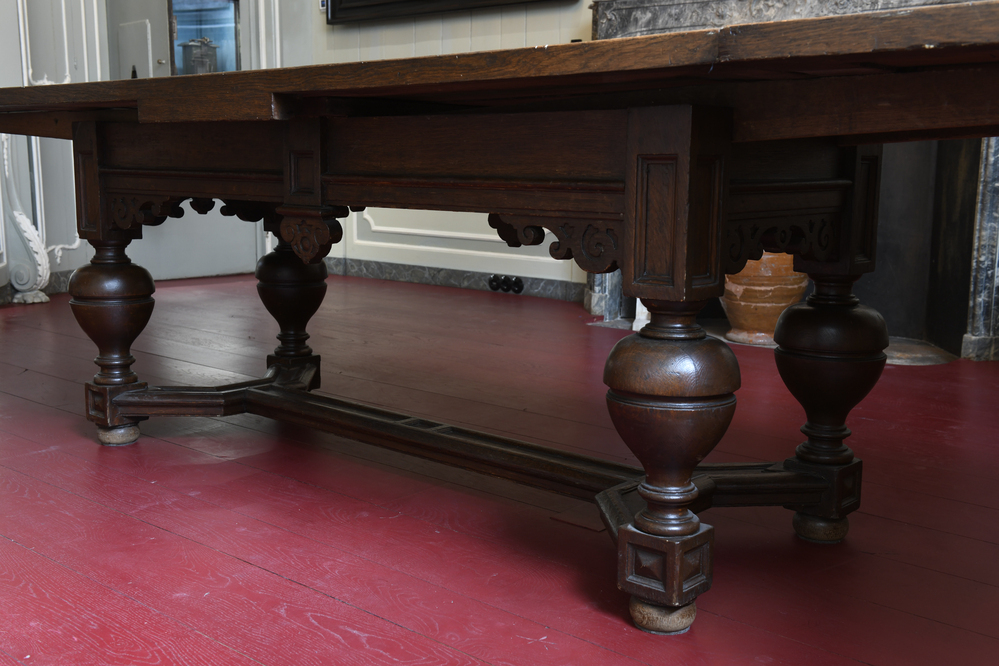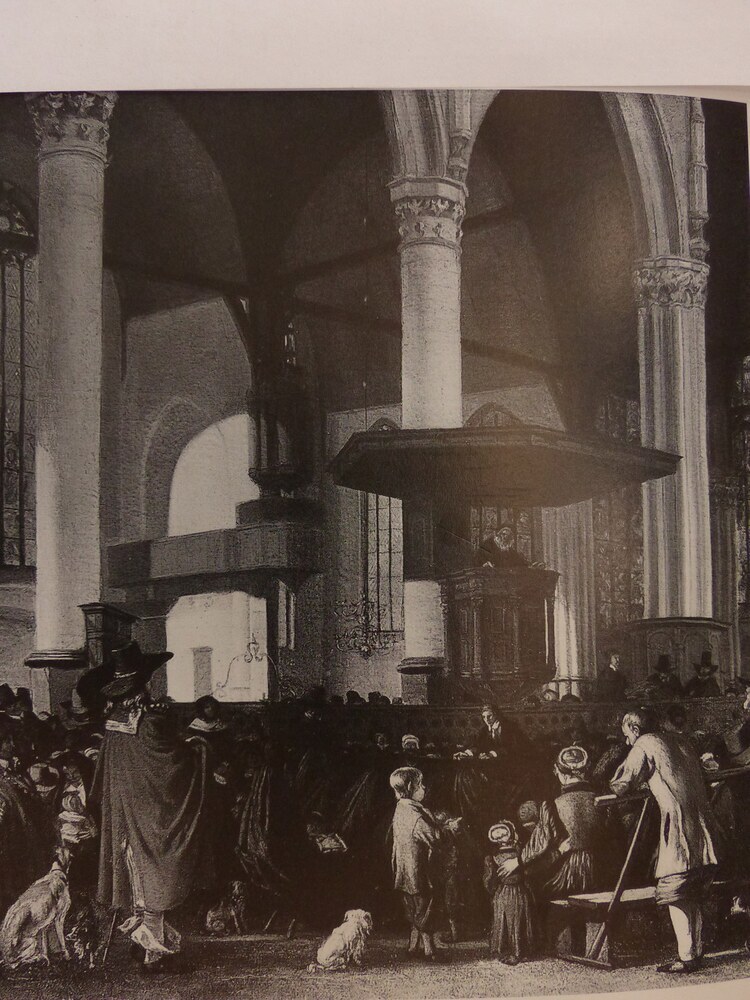 Interieur van de Oude Kerk met preekstoel en pilaarbank gezien vanuit de viering