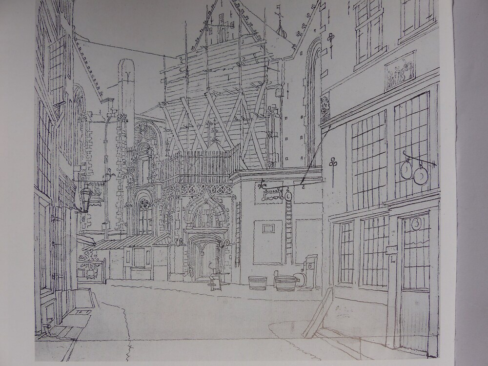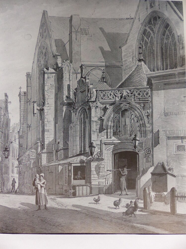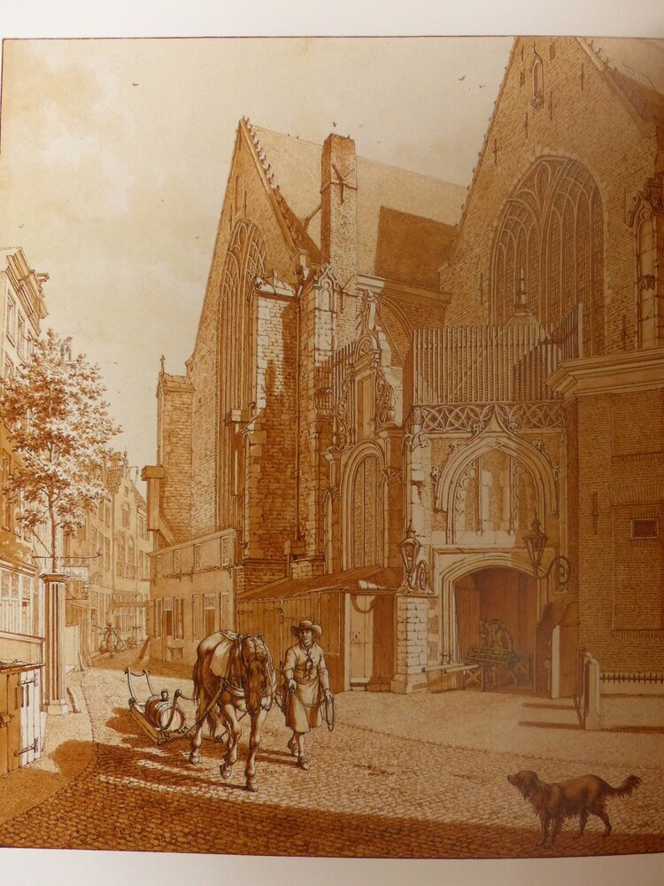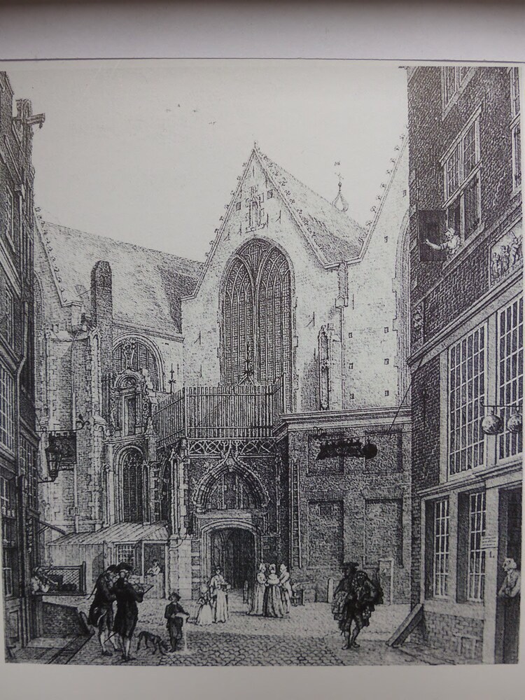 Tekening van de Oude Kerk met zicht op noorderportaal en Heilig Graf vanaf de Enge Kerksteeg