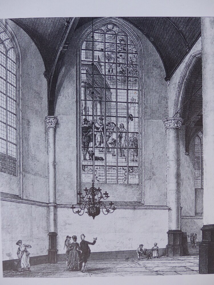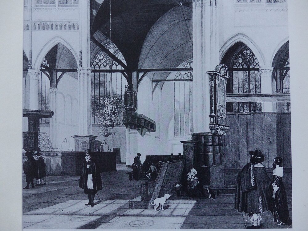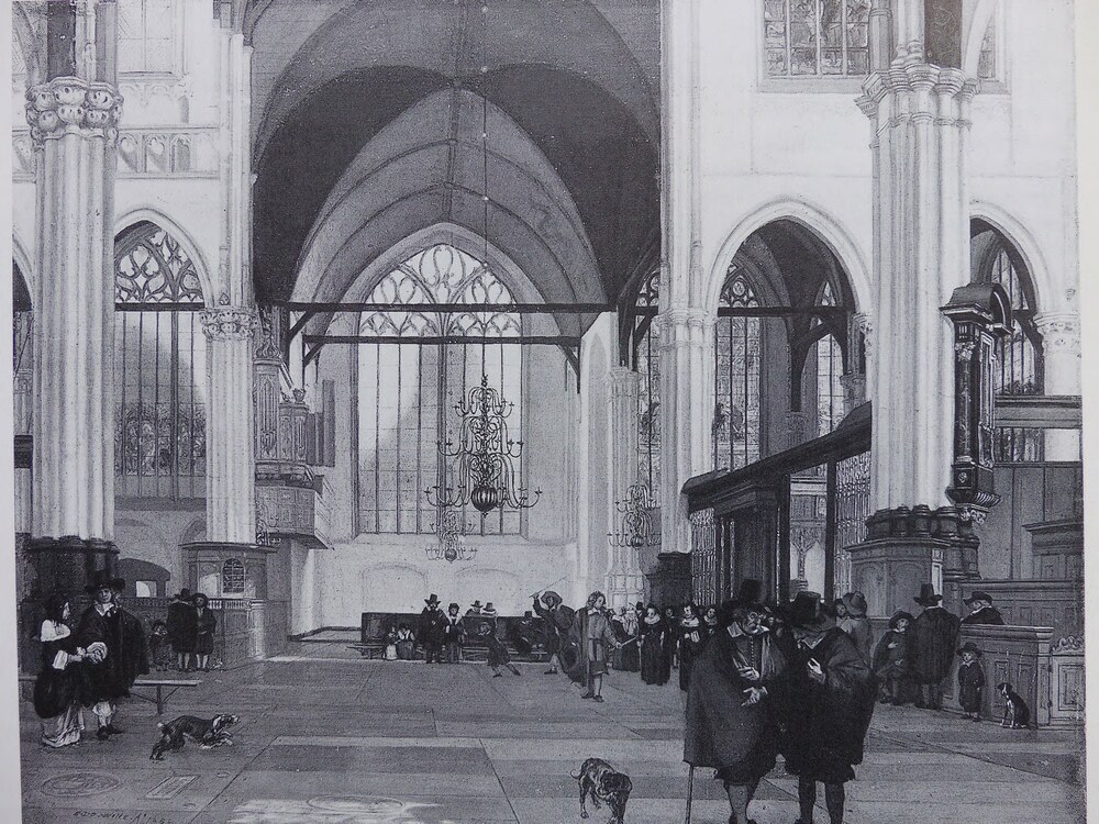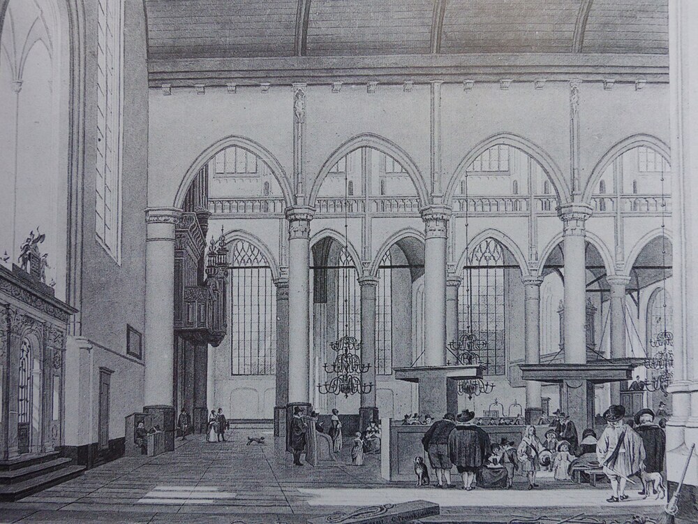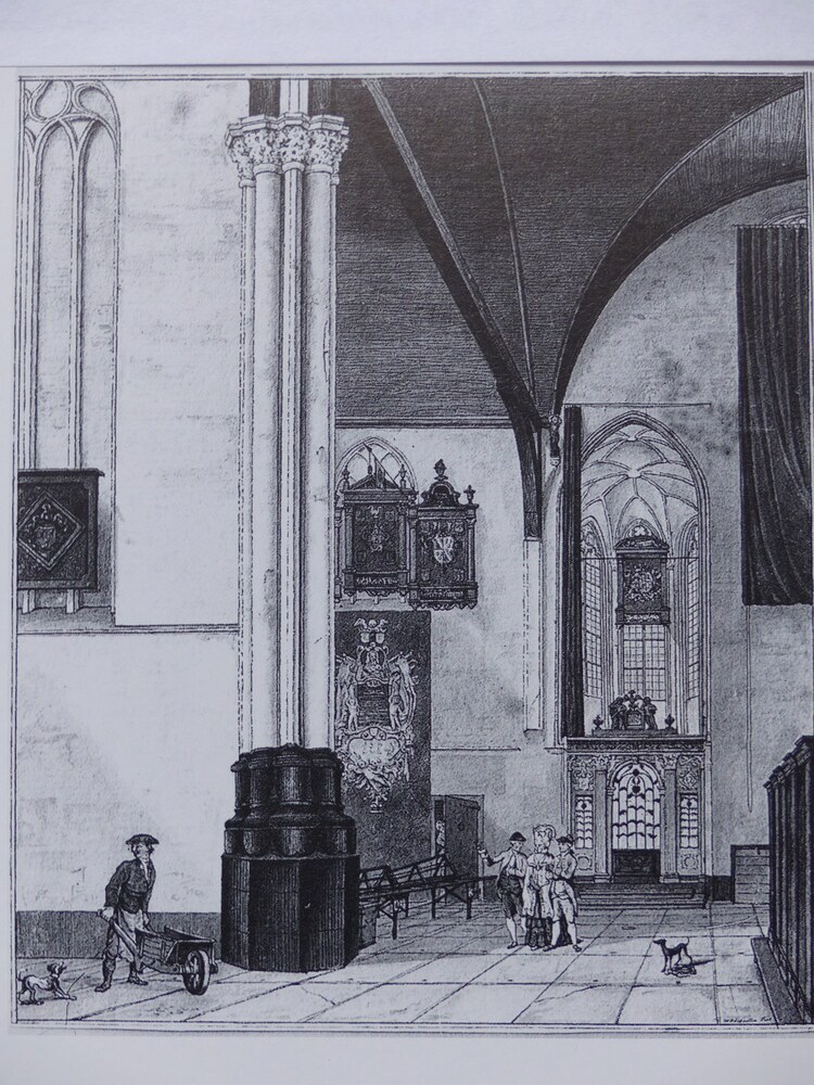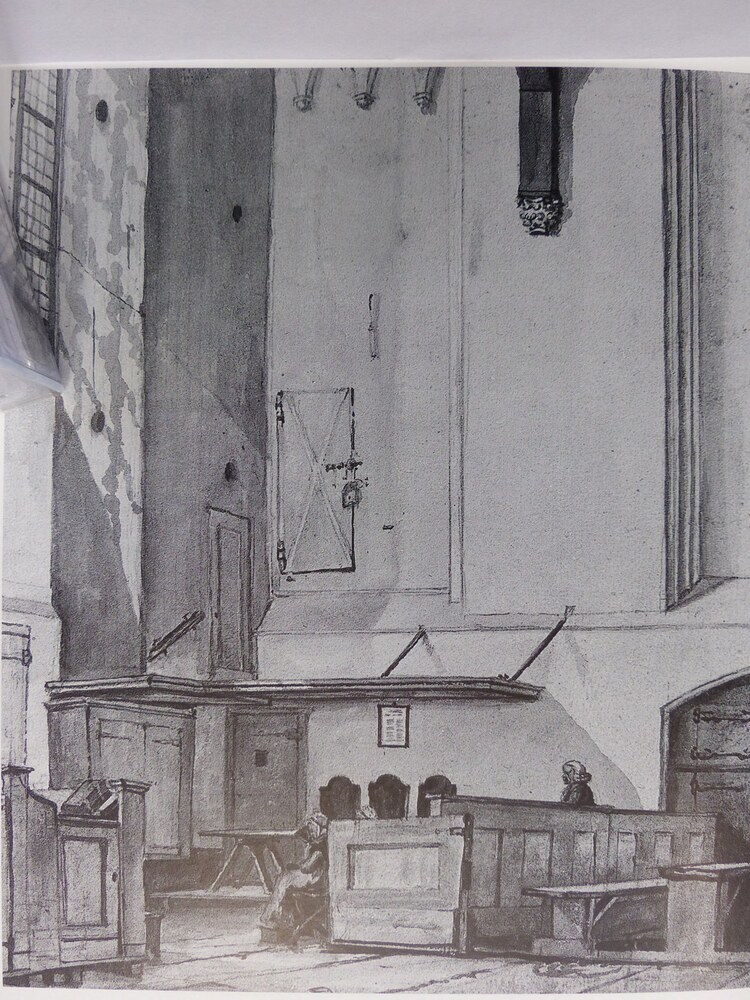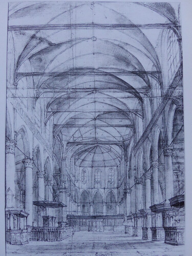 Tekening van het interieur van de Oude Kerk van west naar oost
