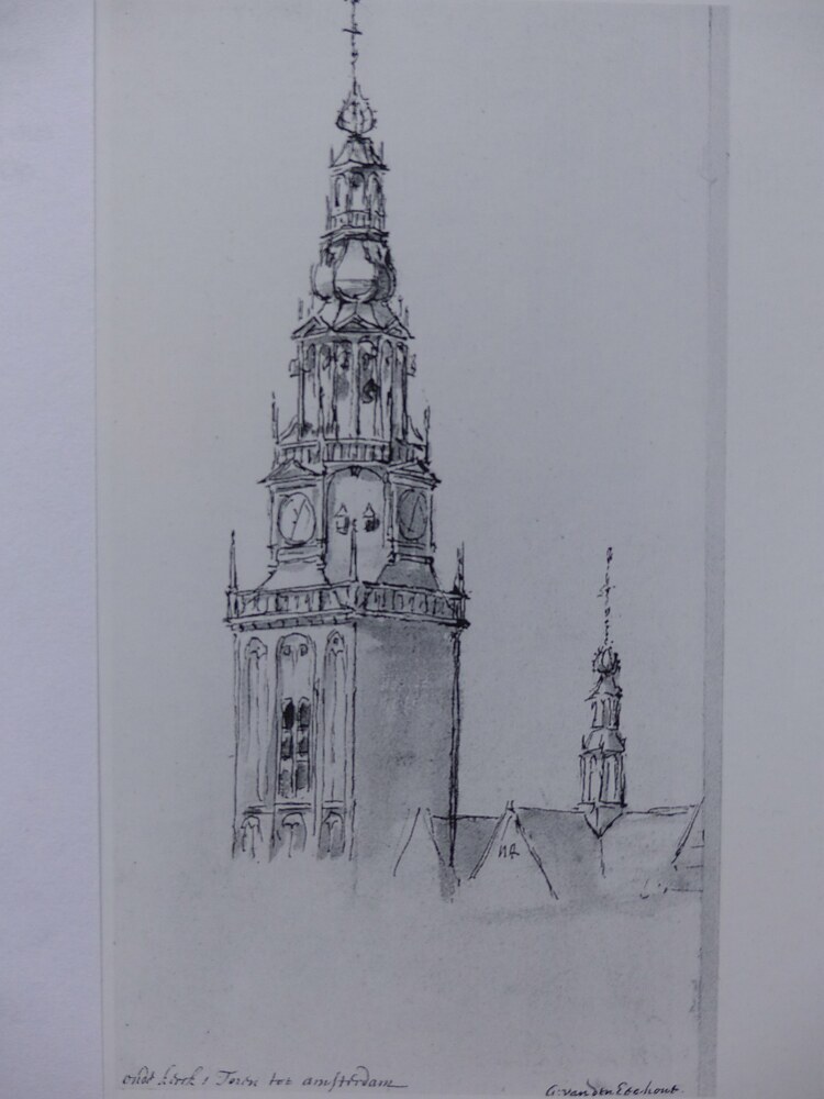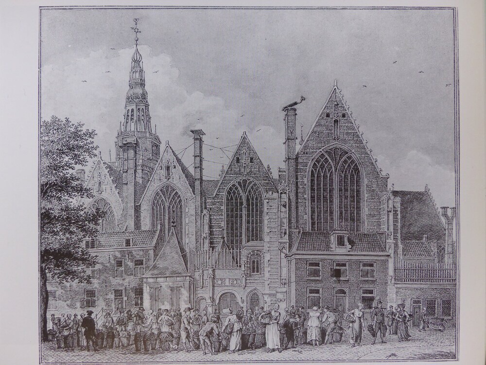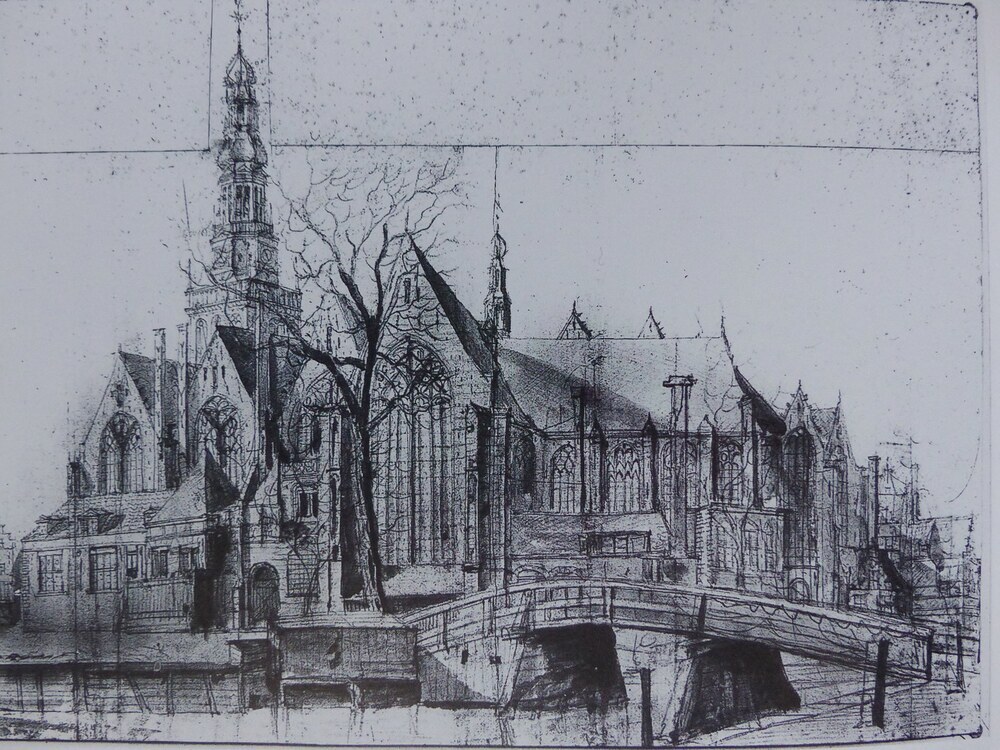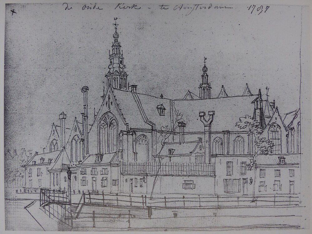 Tekening van de Oude Kerk vanaf de oudezijds Voorburgwal